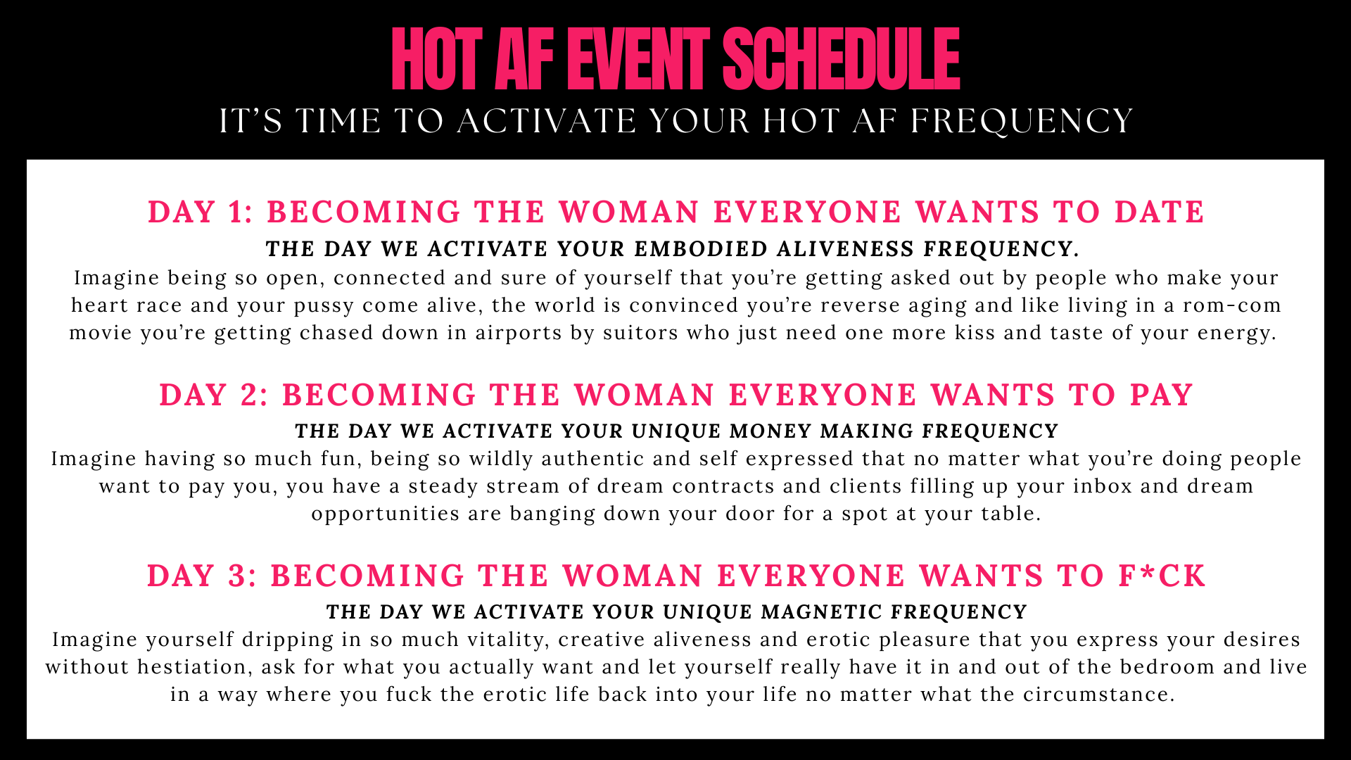 Ready to spend 3 days plus a bonus day of coaching with us to really lock in your HOT AF FREQUENCY?